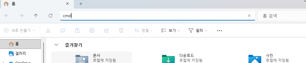 경로표시줄에 cmd를 누르고 엔터를 누릅니다.